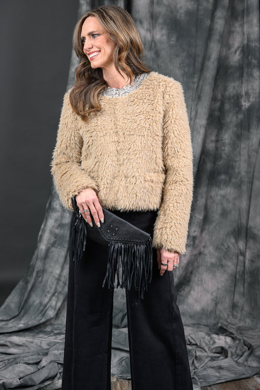 Jewel Embellishment Faux Fur Jacket