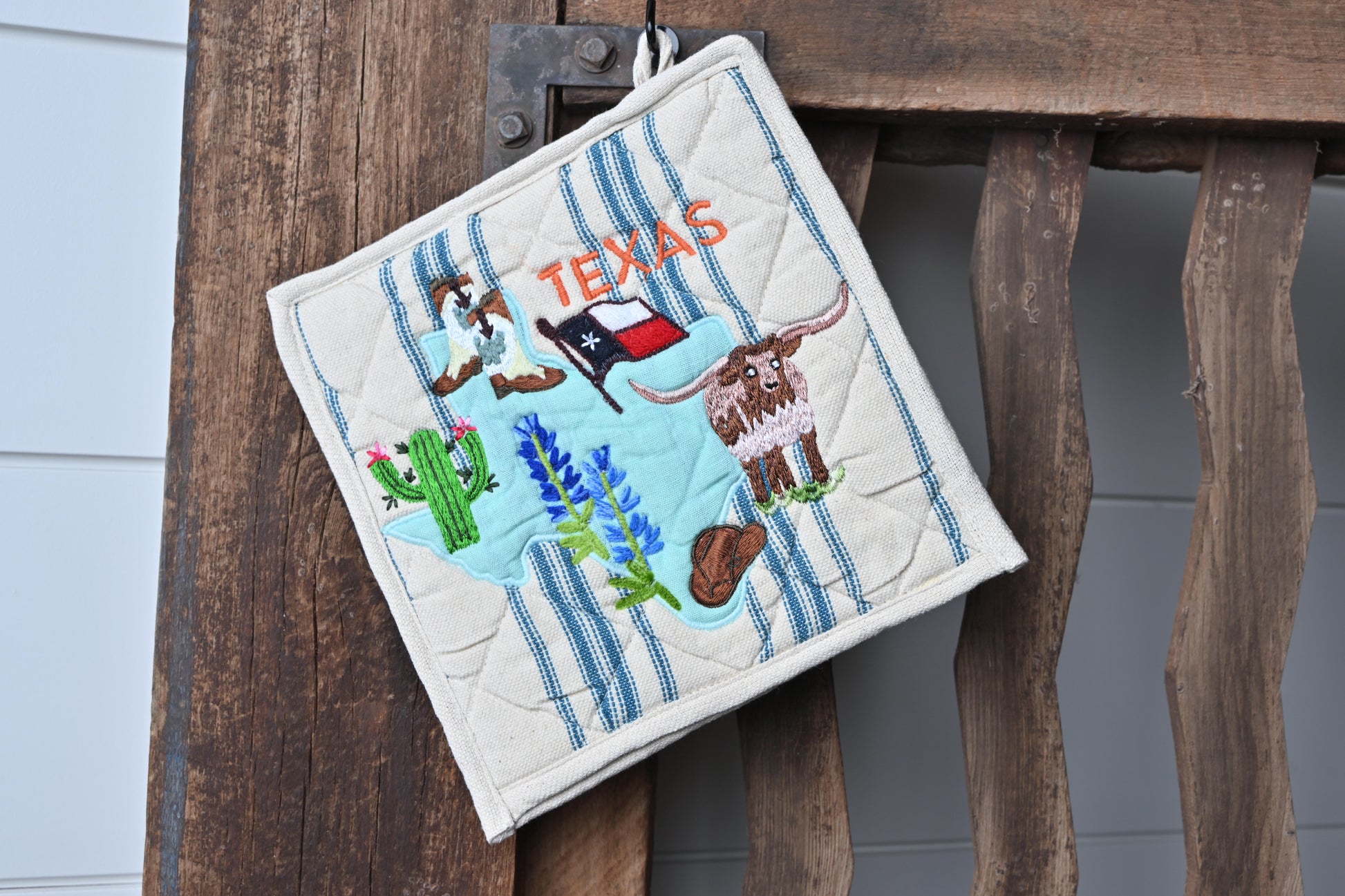 Fun & funky embroidered Texas Icons pot holder by Karma Living