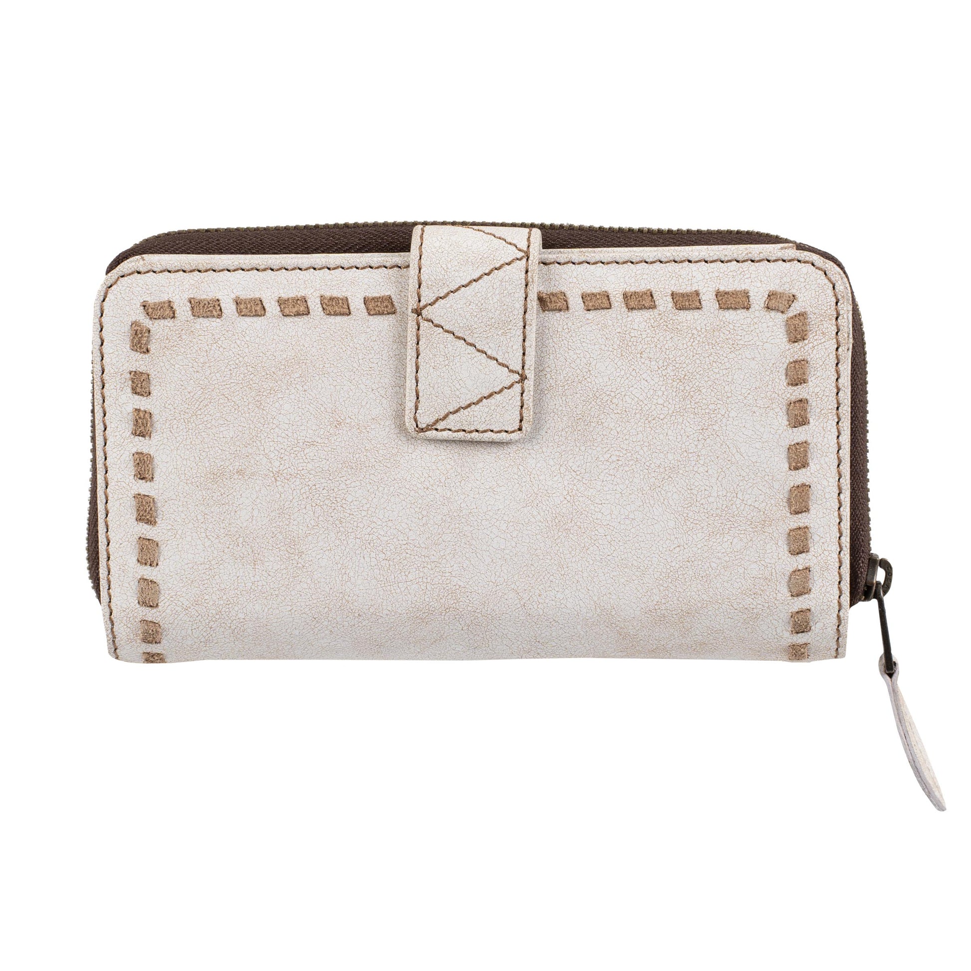 The Cremello Chesea wallet features full grain leather which is crackled to reveal an under crust of soft tanned suede. That same soft tan suede is seen in buck stitch and threaded accents. Finished with distressed hardware for the perfect addition to your Cremello handbag.