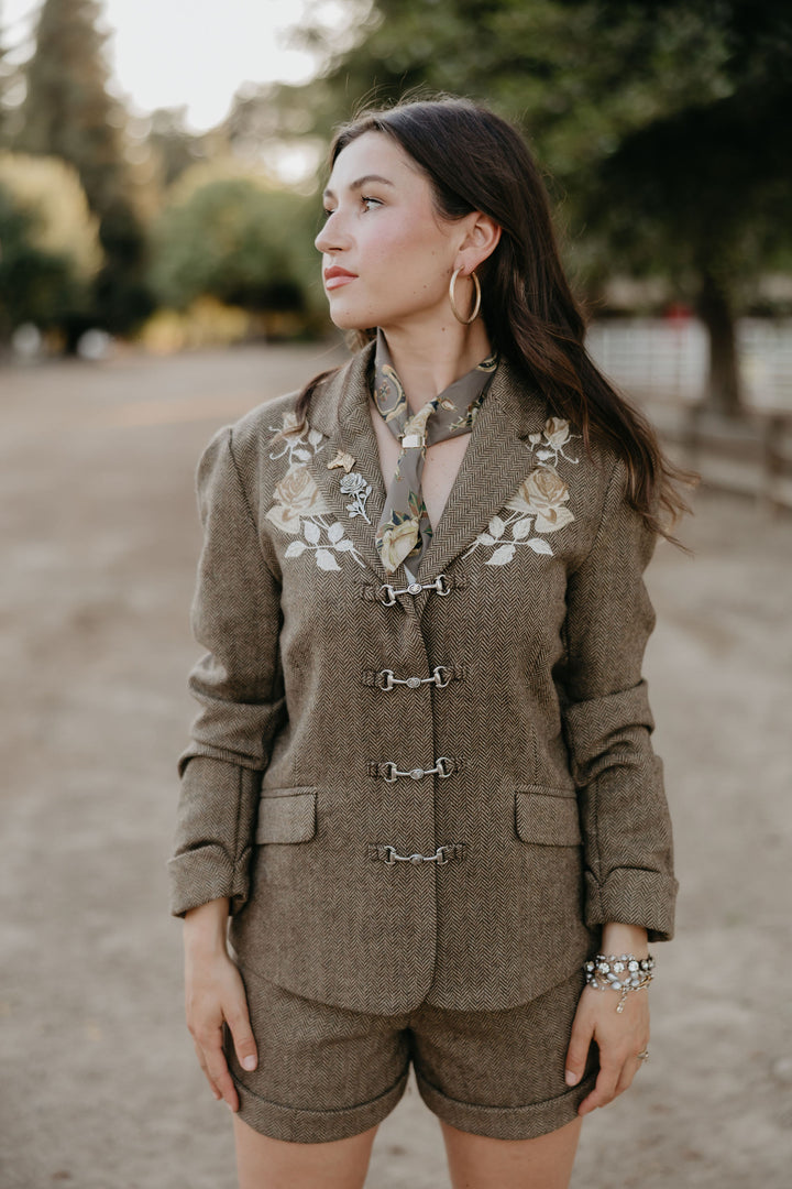 The Holman Herringbone Jacket is a refined reinvention of our classic Johnny Jacket, created in honor of John Holman. A gifted horseman and trainer, his legacy of love of horses and the cowboy way of life lives on in this timeless piece. Made from rich brown tweed with embroidered roses at the shoulders and lucky horseshoe patches on the elbows, it’s a timeless blend of cowboy grit and Western grace.
