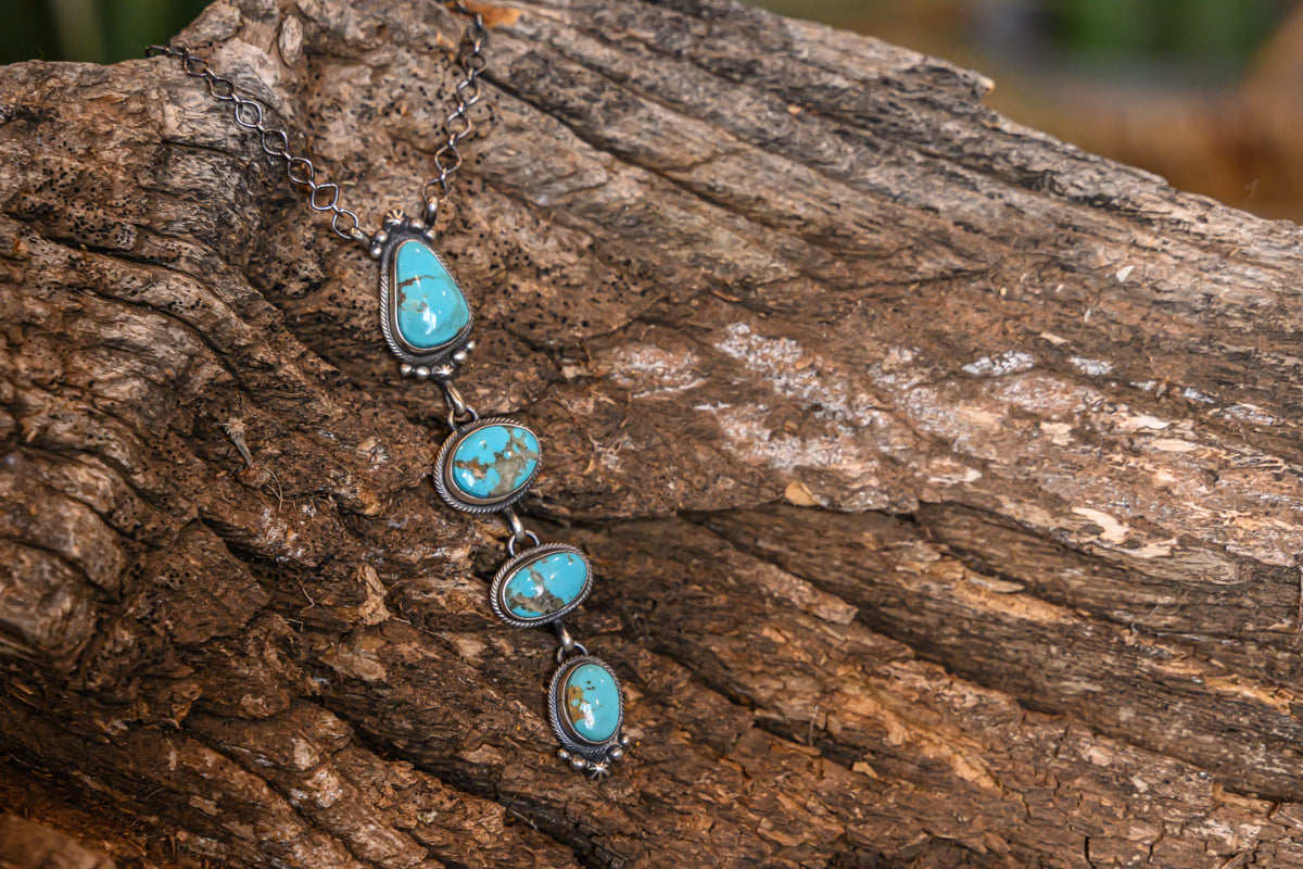 Four vivid sky-blue toned natural turquoise stones in this handcrafted necklace features a striking vertical arrangement. Each stone is set in a sterling silver bezel with a classic twisted rope border in varying shapes, beginning with a teardrop stone at the top, followed by three oval settings creating a cascading and graceful design. The details showcase traditional southwestern silversmithing, with small silver bead accents and a stamped starburst motif on two of the bezels. Truly a graceful and beautiful design.