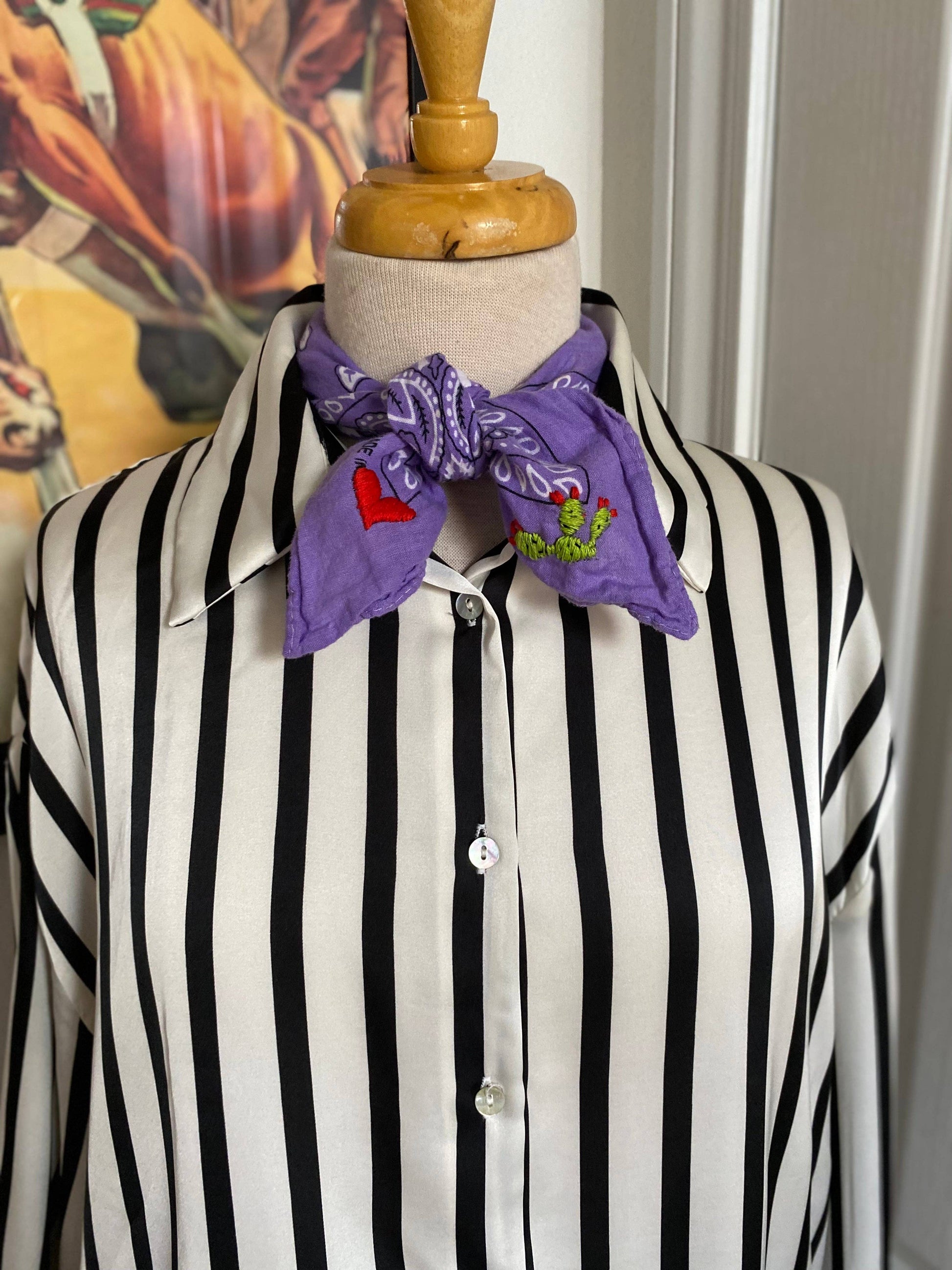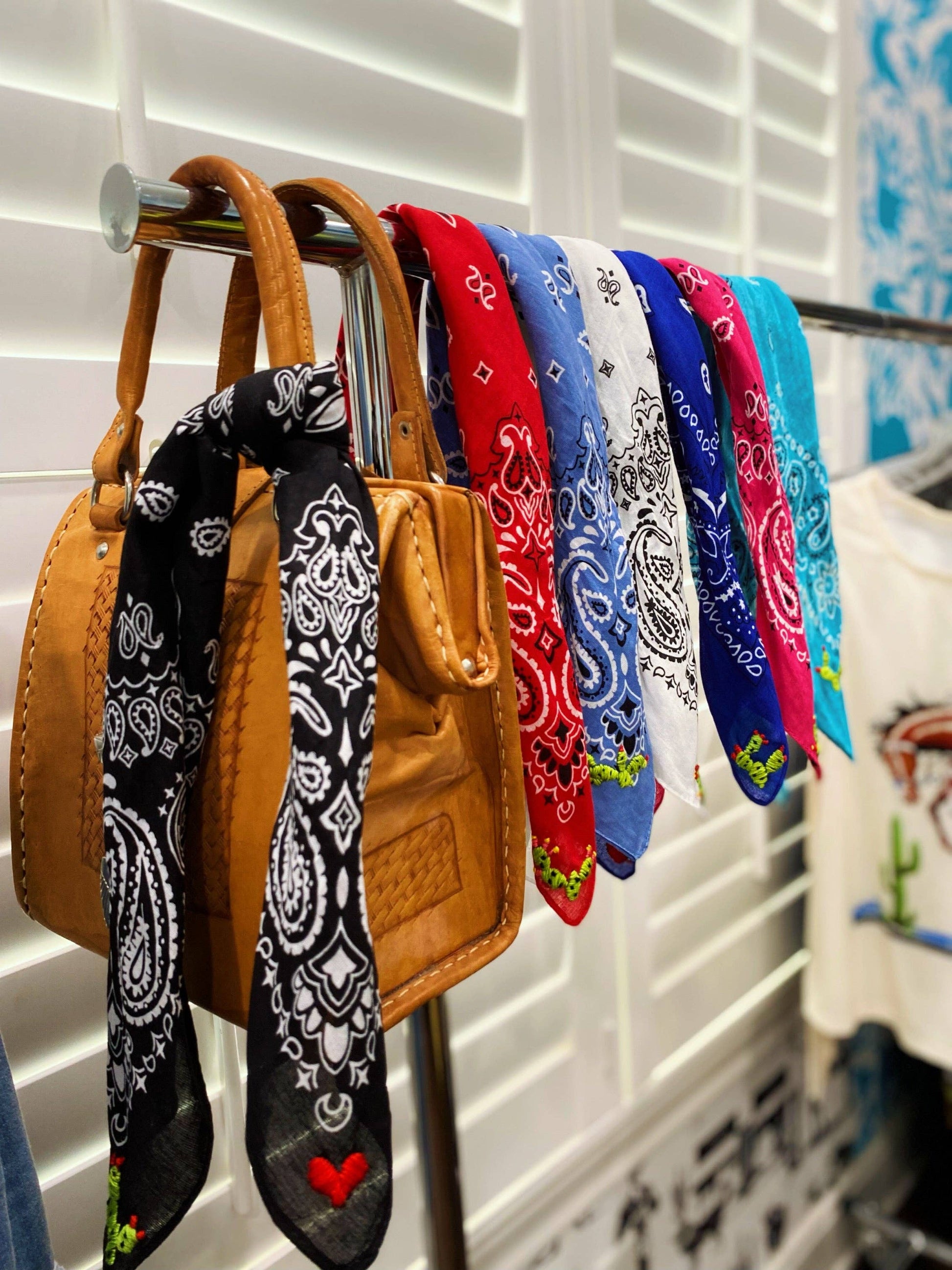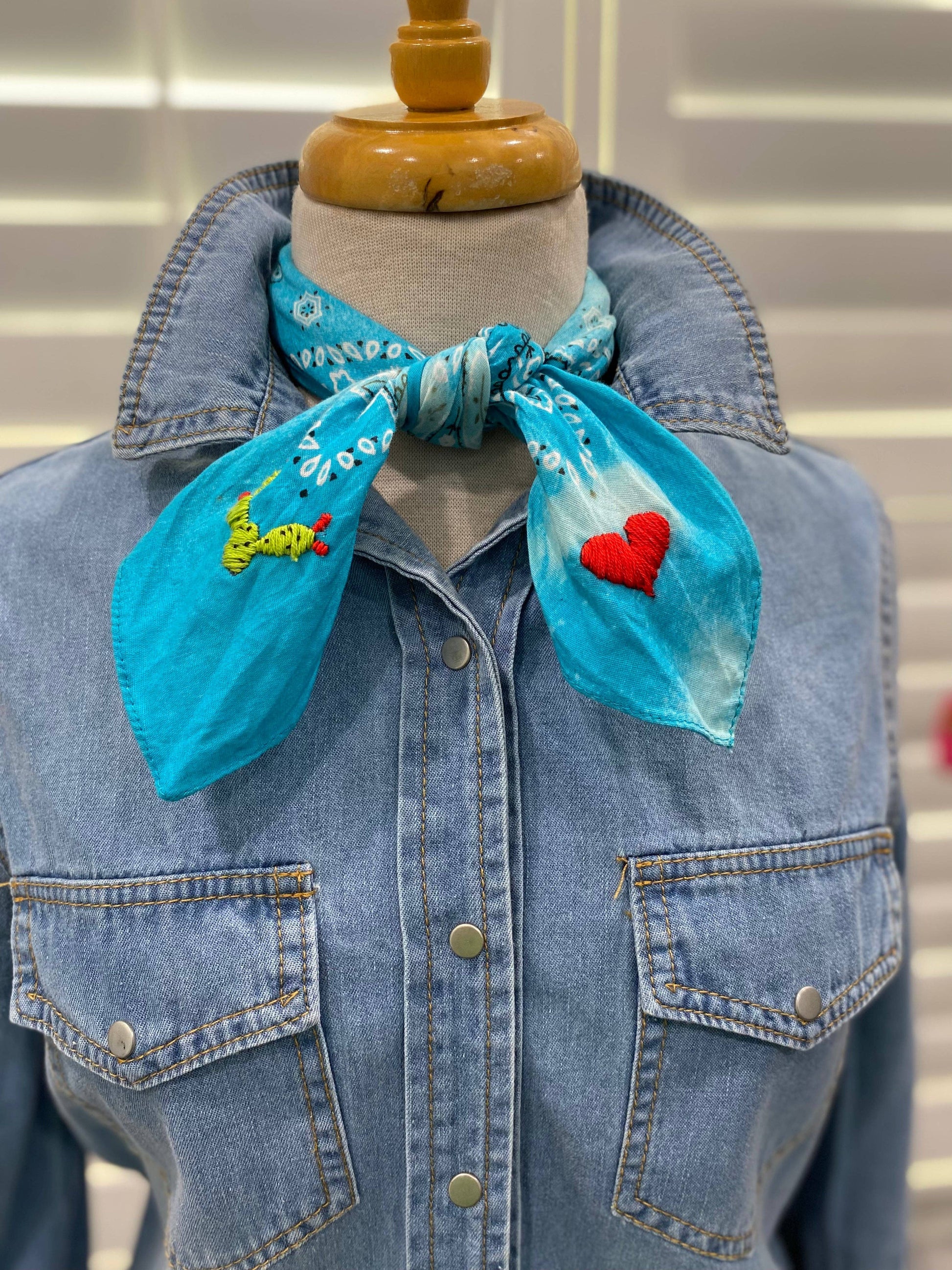 It’s all in the details. Each bandana is hand embroidered with love just for you. No two will be exactly the same. Our bandanas have hand drawn designs and are hand embroidered. You can wear around your neck or in your hair. Tie one on your fave bag or around the neck of your favorite dog! Choose from various colors. Care- wash in cold water. Hang dry. 21” x 21”
