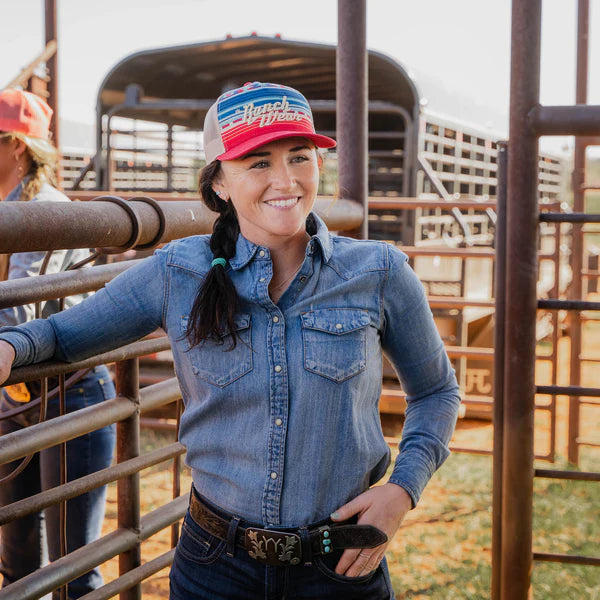 Classic trucker style hat with STS Ranchwear puff embroidery and an adjustable plastic snap backstrap.