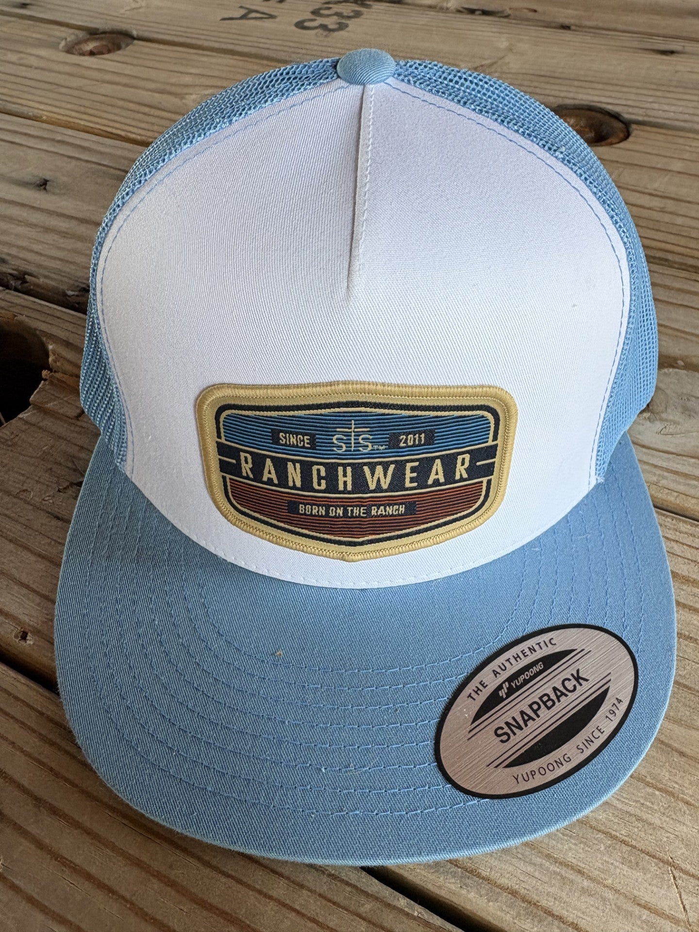 STS White/Baby Blue - Born on Ranch Patch Crafted with premium white front paneling and breathable baby blue mesh, this cap delivers comfort and style for all-day wear. The signature STS patch featuring "Born on the Ranch" embroidery adds authentic character and heritage appeal. Ideal for those who value quality construction and meaningful design details.