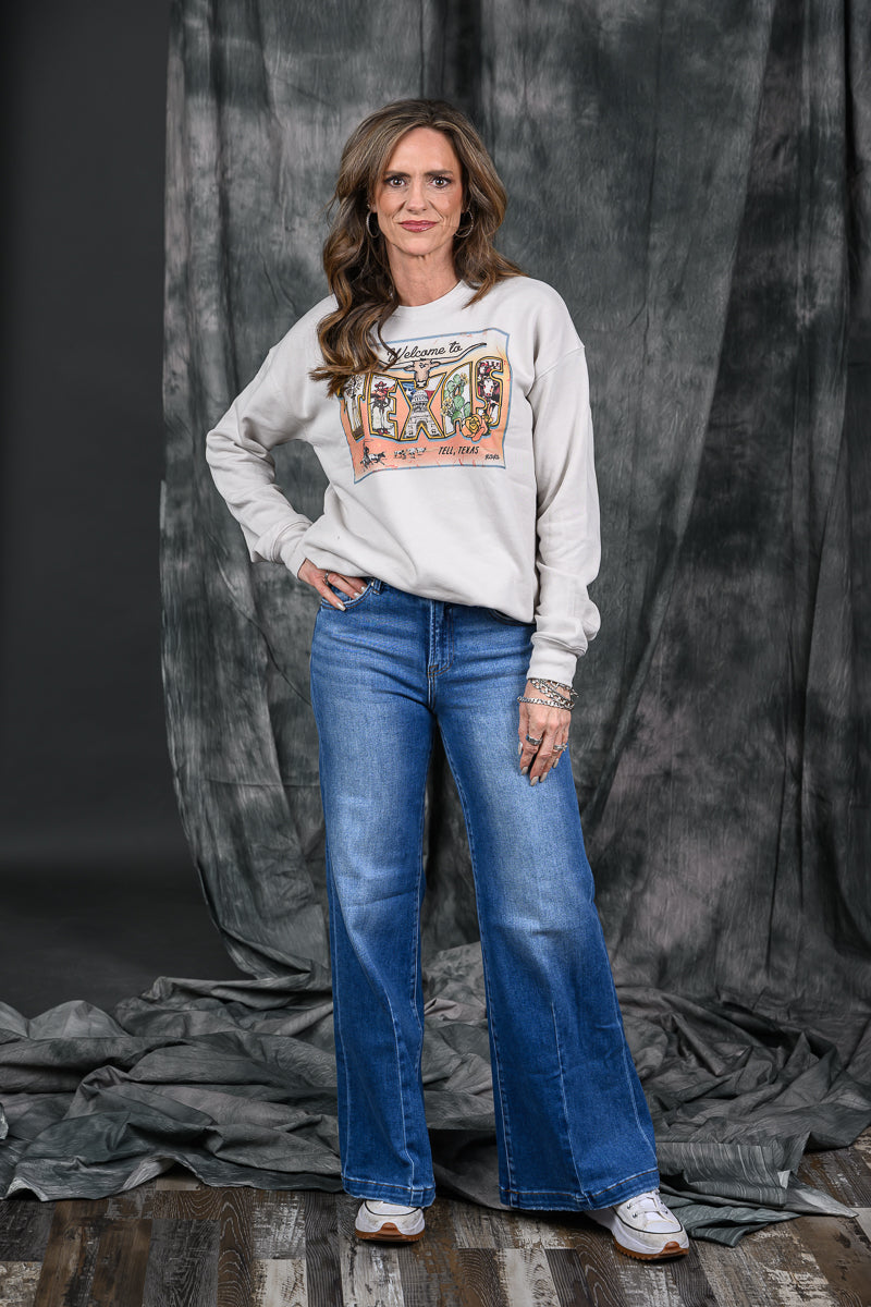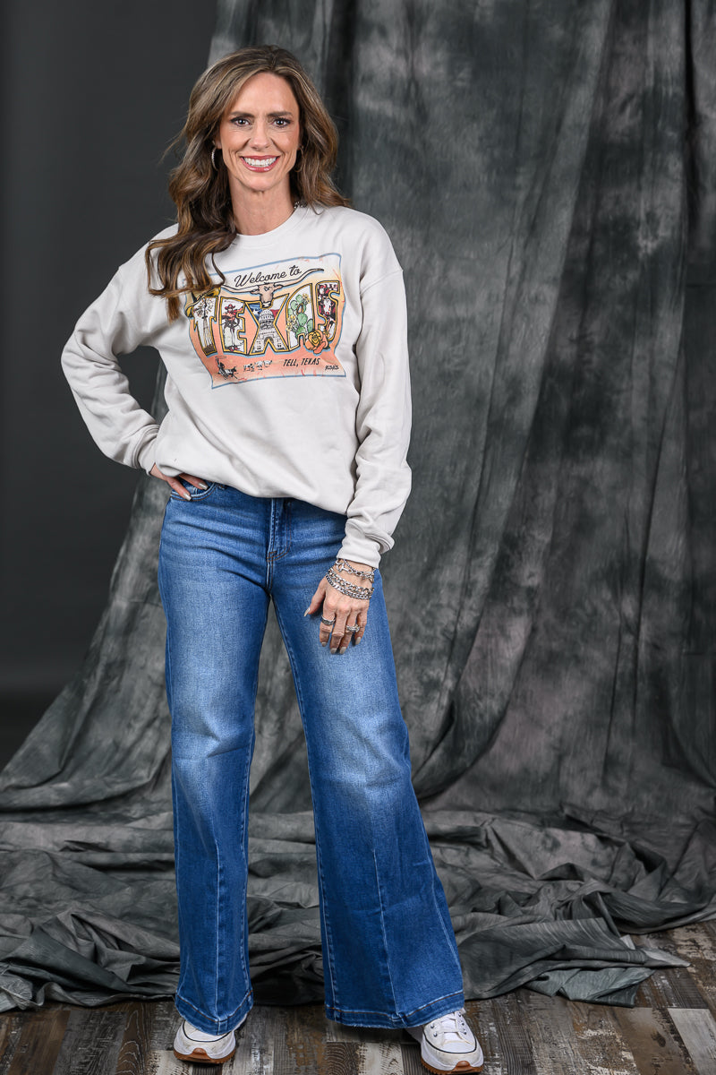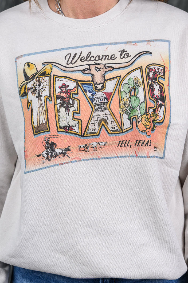 Texas Postcard Sweatshirt, tagging our favorite little community, Tell Texas, where our heritage is rooted. Super soft, high quality sweatshirt from one our favorite brands XOXO, IYKYK ;)
